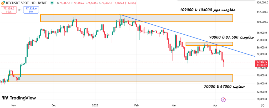 چند روز پیش ( 2 آوریل – 13 فروردین) بود که ترامپ چند تعرفه سنگین را بر واردات کالا از آمریکا و صادرات کالا از آمریکا اعمال کرد. بسیاری از تحلیلگران و کارشنانسان اقتصادی معتقد بودند که این افزایش تعرفه ها توسط آمریکا می تواند یک واکنش متقابل از جانب چین یا اروپا را داشته باشد و درنهایت منجر به وقوع یک جنگ تجاری شود. در ادامه همین اتفاق افتاد و در 5 آوریل بود که چین در اقدام تلافی جوانه تعرقه 34% را برای محصولات آمریکا اعمال کرد. اکنون که در 7 آوریل هستیم، می بینیم این تعرفه ها به خوبی بر روی بسیاری از دارایی ها از جمله بیت کوین اثر گذاشته اند و سبب ریزش شدید قیمت آن ها شده اند.