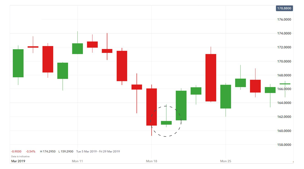 الگوی چکش معکوس از یک کندل با بدنهی کوچک و یک سایه بالایی بلند تشکیل شده است. در این الگو، قیمت بسته شدن بالاتر از قیمت باز شدن است. قدرت سیگنال این کندل به بدنه و طول سایه بستگی دارد.
