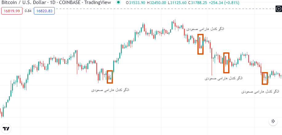 این کندل در حقیقت یک الگوی بازگشتی صعودی است که در انتهای یک روند نزولی تشکیل میشود. پس از تشکیل این الگو، انتظار می رود بازار صعودی (گاوی) شود. در برخی بازارها مانند بورس، کندل ها به صورت روزانه ثبت و بررسی می شود و تایم های پایین تر کارایی ندارد اما در بازار فارکس یا ارز دیجیتال ، میتوان این الگو را در تایم های پایین تر از جمله 4 ساعته ، 1 ساعته و یا پایین تر پیدا و استفاده کرد. در هارامی های صعودی، کندل مادر به رنگ قرمز و کندل فرزند به رنگ سبز ظاهر میشوند. کل کندل دوم، در محدوده کندل اول قرار دارد.