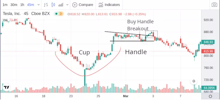 ارتفاع فنجان را به نقطه شکست دسته اضافه کنید، آن رقم حد سود شماست. گاهی اوقات سمت چپ فنجان ارتفاع متفاوتی نسبت به سمت راست دارد. بهتر است از ارتفاع کمتر استفاده کنید. همچنین میتوانید از ابزار فیبوناچی برای تعیین حد سود و حد ضرر استفاده کنید.